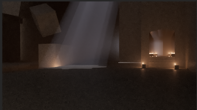 I kept it simple with an ambient light to fill the room, an atmospheric fog, and a point light for the god ray. There were discussions of the main character having his own personal light to light up other areas and so I used point lights for those.,
